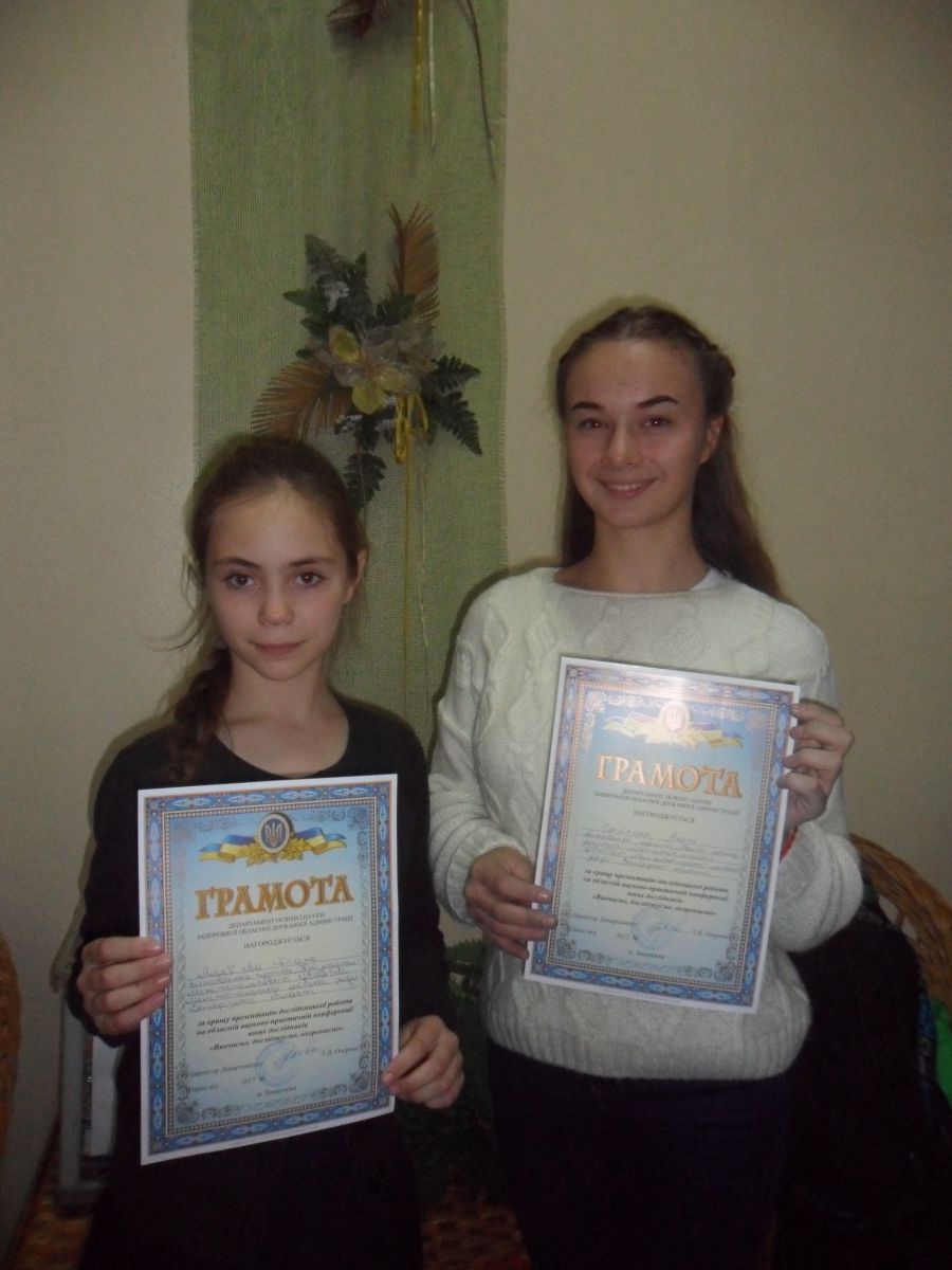 Воспитанницы Мелитопольского центра эколого-натуралистического творчества ученической молодежи Анет Гайченя и Диана Алябьева награждены грамотами департамента образования и науки Запорожской облгосадминистрации за свои исследовательские работы, которые они представили на областной научно-практической конференции "Изучаем, исследуем, охраняем".