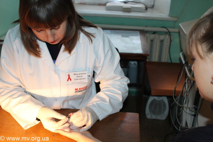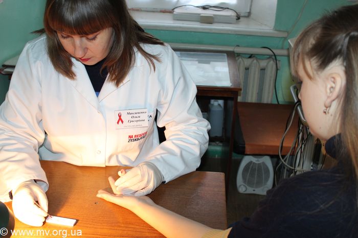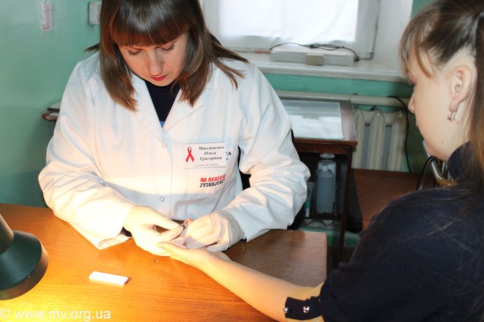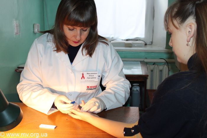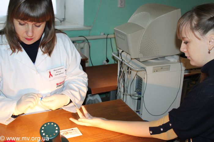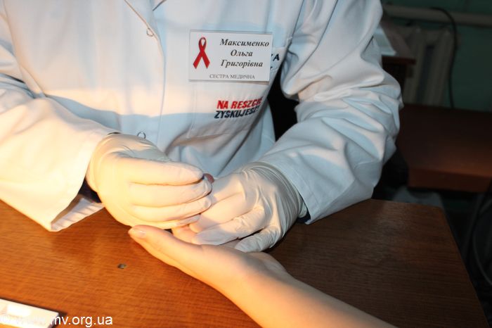 «Заходите-заходите, мы вам сейчас все покажем. А ну-ка, подставляй руку!», – такими словами автора этих строк встретил врач кабинета доверия центра Александр Гаркуша. Обратился он с предложением провериться на СПИД не мне, а одной из медсестер, которая с легкостью, ради нескольких фотографий, села на место, где сидят обычно пациенты. И подставила свой палец под укол. Старшая медсестра кабинета доверия Ольга Максименко уверенными и отработанными движениями уколола коллегу в палец и быстренько капнула ее кровь на специальный тест и тут же перевернула маленькие песочные часики.