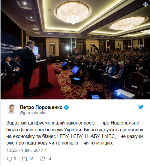 Порошенко выступил на бизнес-форуме в Киеве Президент Украины Петр Порошенко анонсировал создание Национального бюро финансовой безопасности Украины.