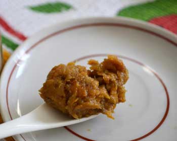 4. Получив однородную массу, смешать ее с медом (5-6 ст. л. или больше) и выложить в стеклянную банку.