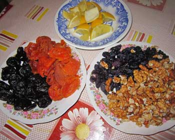 Сухофрукты длительное время сохраняют свои полезные свойства, а значит идеально подходят для домашних заготовок. В этот рецепт входит курага, изюм кишмиш, чернослив, финики, сушеные яблоки и груши, грецкие орехи (все ингредиенты по 200 г) и лимон (1 шт.). В переводе на «витаминный язык», получаем бета-каротин, B1, B2, B3, B4, B5, B6, B9, C, E, K, PP.
