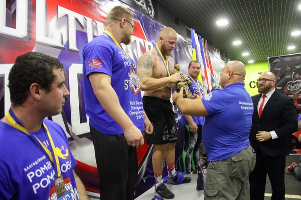 Сначала состоялся квалификационный тур, когда спортсменам нужно было одолеть штангу весом 300 кг. Канадец Джеймс Макгрегор и норвежец Кристер Баккен Ларсен вес не осилили вес и сошли с дистанции. Грузин Георгий Метивишвили потянул спину и тоже не продолжил борьбу. У прошедших квалификацию богатырей было по три подхода с повышением веса: до 350 кг "шаг" составлял 10 кг, после 350 кг вес можно было повышать на 5 кг. Тима Сахара (Канада) остановил в движении к победе вес 310 кг. На этом же показателе остановился и Андрей Ананьев (Украина). Поднятая штанга весом в 320 кг принесла бронзовую медаль канадцу Полу Бинэту. Норвежец Свейн Эрик Хауглэнд после успеха с весом в 340 кг заказал себе еще 10 кг сверху, но потом увидел результаты соперников, подумал о сохранении сил на завтрашних ответственных соревнованиях, пожалел травмированное бедро и остановился, став серебряным призером мирового чемпионата.
