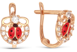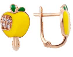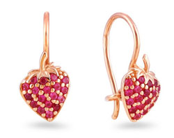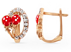 • серьги с фианитами и эмалью. Такой вариант достаточно эстетичен и несколько скромен, зато имеет массу вариантов дизайна: малинки, вишенки, листики, бабочки, цветочки - можно найти что угодно. Малышка останется довольна! Но, кроме своих внешних качеств, такие украшения имеют еще одно достоинство - их можно одевать сразу же после медицинских гвоздиков. Благодаря своей форме такие серьги не закупоривают прокол.