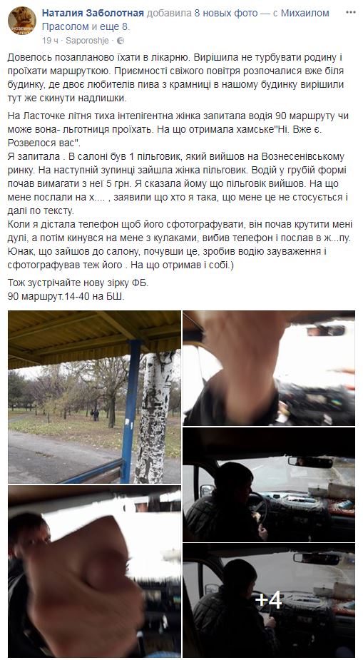 Как рассказала Наталья, водитель маршрутки № 90 необоснованно отказал в проезде льготникам, а на ее замечания отвечал нецензурной лексикой, а когда та хотела его запечатлеть на камеру телефона, маршрутчик начал крутить дули в камеру и выбивать телефон из рук. Также и досталось другому пассажиру, который зашел в это время в салон и на происходящее сделал замечание.