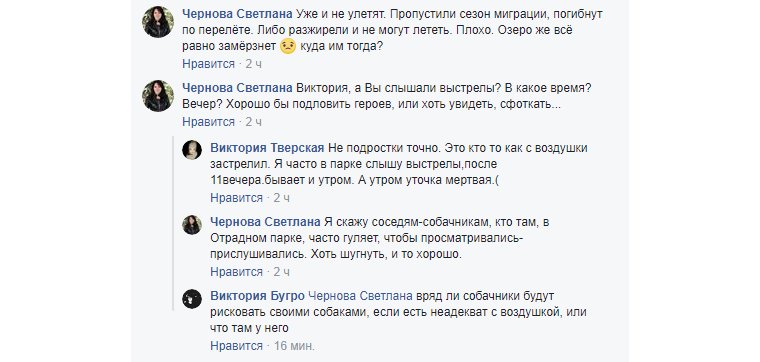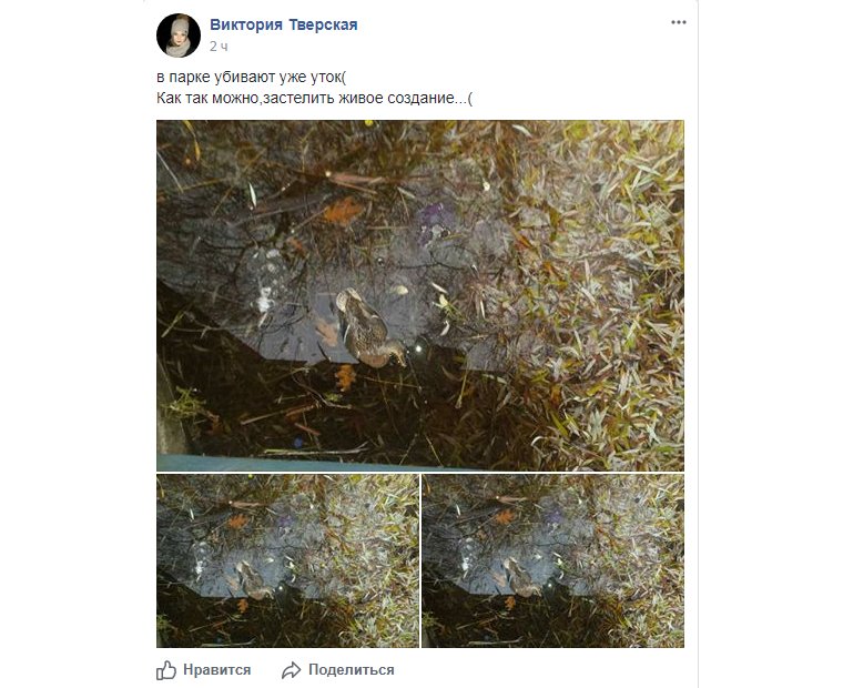 "В парке убивают уже уток. Как так можно - застрелить живое создание..." - написала Виктория Тверская.