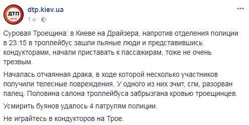 Отмечается, что группа неизвестных в алкогольном опьянении зашла в троллейбус и, представившись кондукторами, они начали приставать к тоже не очень трезвым пассажирам. Затем завязалась драка.