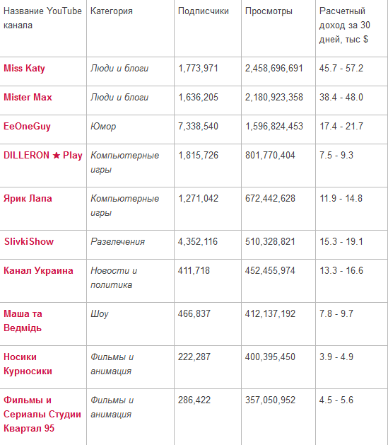 По данным издания «Экономическая правда», ссылающейся на сайта vspstats.com который принадлежит компании VSP Group, официальной российской партнерской программе YouTube, первая десятка украиснкого видеоблогерства в 2016 году выглядела следующим образом: