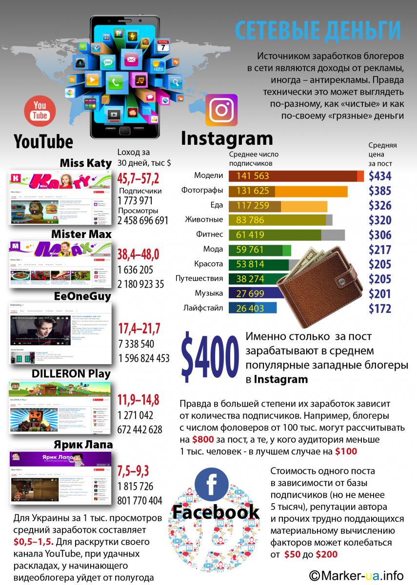 Скажем, популярные западные блогеры в Instagram зарабатывают в среднем около $300 за пост.