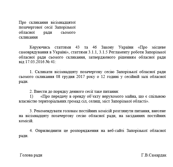 Как говорится в распоряжении, народные избранники рассмотрят проект решения о передаче в аренду объекта недвижимого имущества, которое является собственностью территориальных громад сел, городов Запорожской области. Отмечается, что принятие данного проекта позволит включить отопление для жильцов дома по улице Зеленой, 35. Отопление этого дома осуществляется из котельной интерната, но интернат не может предоставлять платные услуги по отоплению.