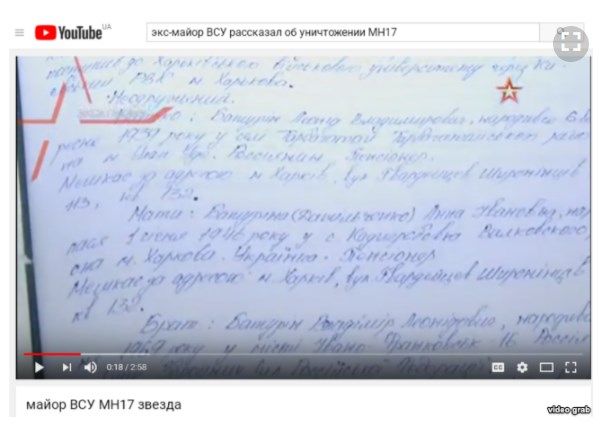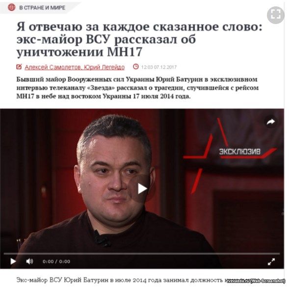 7 декабря канал Минобороны России "Звезда" подал интервью с якобы бывшим офицером ВСУ Юрием Батуриным. Мужчина говорит, что был начальником командного Пункта воинской части А-1215 и свидетелем сбивания рейса MH-17. По его словам, украинские военные рассказали ему, как к катастрофе они перевезли "Бук" в поселок Зарощенское, откуда, как говорит он, был пуск ракеты по самолету "Малайзийских авиалиний". Также он сказал, что видел, как "Боинг" исчез с мониторов.