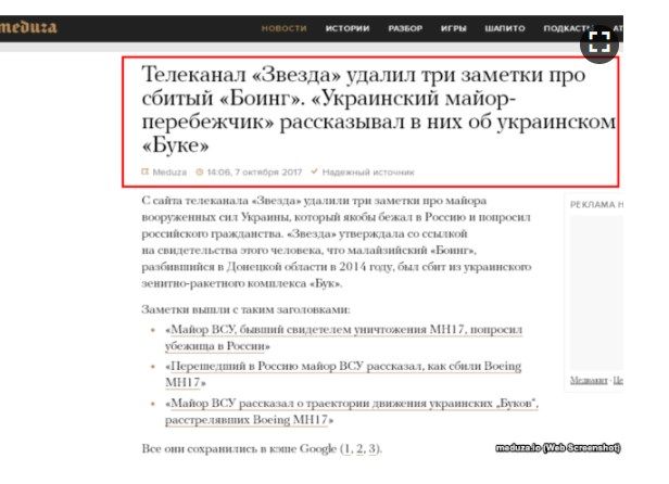 Российские СМИ после этого вышли с заголовками: "Боинг" над Донбассом все-таки сбил украинский "Бук", "Экс-офицер ВСУ рассказал, кто на самом деле виноват в катастрофе" Боинга "под Донецком" и рядом подобных.