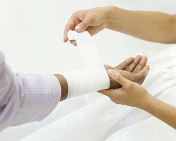 6. Через неделю место ожога нужно очистить. Для удаления омертвевшей кожи бинт смочить в физрастворе или другом изотоническом растворе; процедуру проводить осторожно, не отдирая кожу.