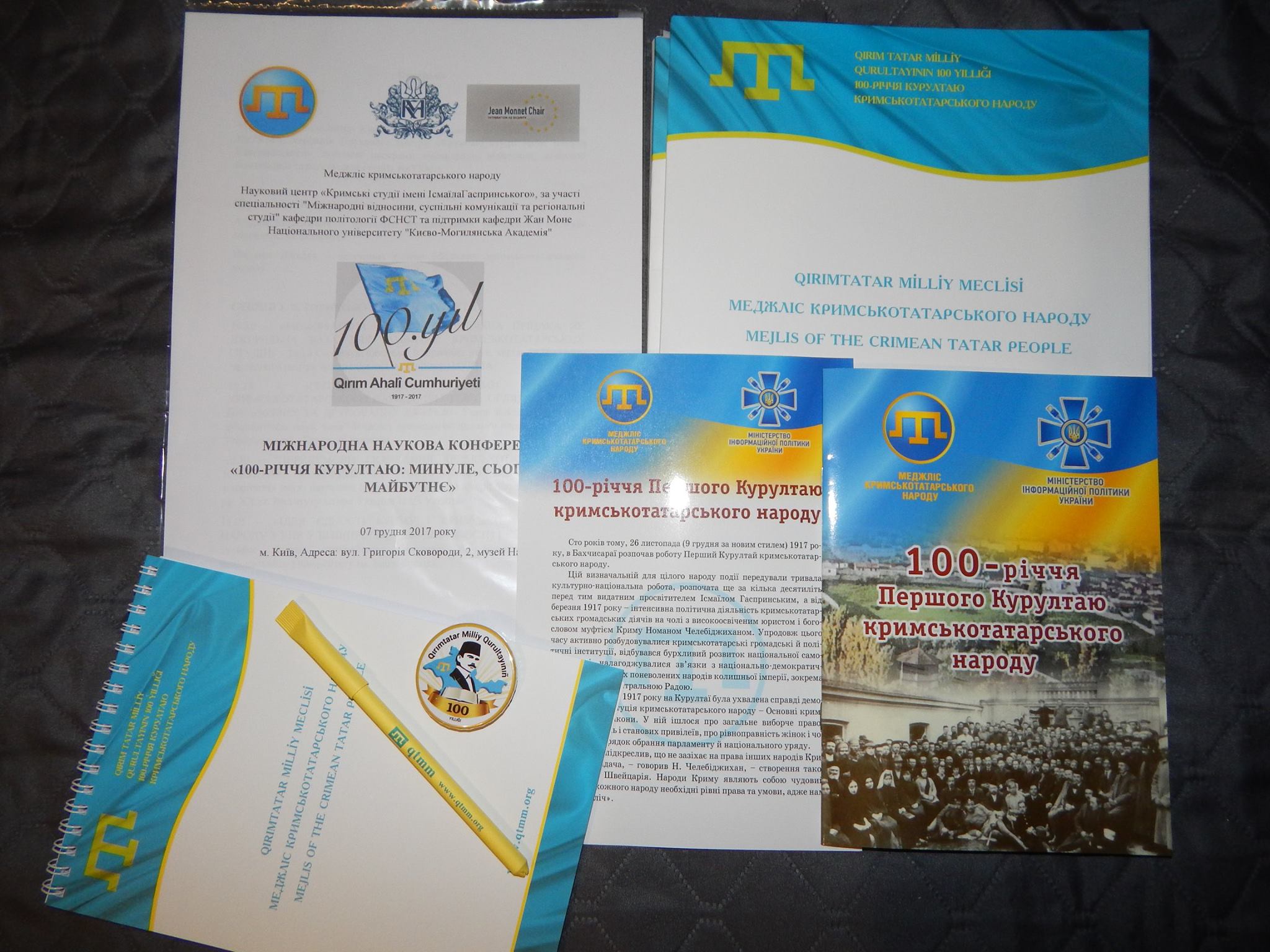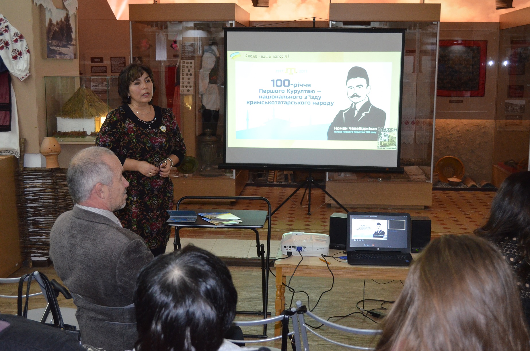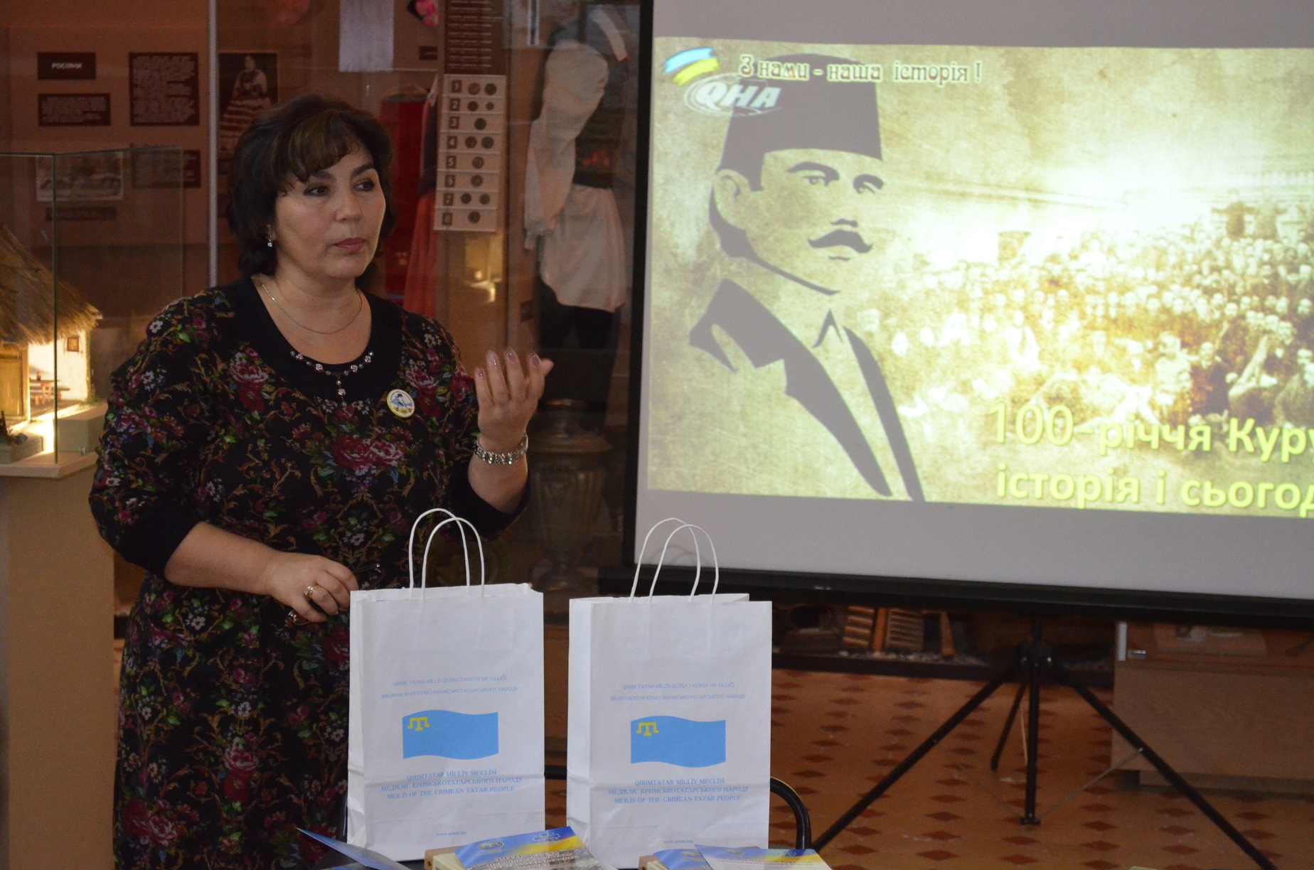 На круглом столе в музее состоялась презентация документального фильма, созданного телеканалом АТР "Первый Курултай крымскотатарского народа". Была представлена памятная монета "100-летие первого Курултая крымскотатарского народа", выпущенная Национальным банком Украины, которая пополнит фонды музея. "Союз краеведов Мелитопольщины" и представители МГПУ им. Б. Хмельницкого получили подарочные наборы, в которые вошли: информационный листок и брошюра, разработанная Министерством информационной политики Украины совместно с известным крымскотатарским историком, нашей землячкой Гульнарой Бекировой, в которой коротко рассказывается об основных задачах Курултая, его целях и истории; книга крымскотатарского писателя Юнуса Кандима "Не заросте травою поле бою...", посвященная председателю первого Курултая Номану Челебиджихану с послесловием кандидата исторических наук Андрея Иванца. Присутствующие ознакомились с докладом сотрудника научной библиотеки Львовского национального университета им. Ивана Франко Зульфие Ягъяевой "Ідея єдності Криму і кримськотатарського народу з УНР у візії (програмній діяльності) І Курултаю", представленным на международной научной конференции в Киеве.