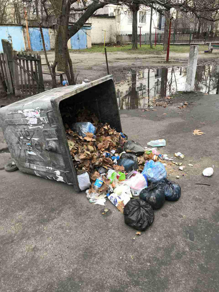Хотя, возможно, бак случайно завалили бездомные, любящие поискать в них чего-нибудь для себя полезное. А поднять сил уже не хватило.
