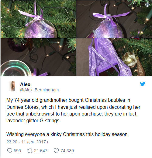 Уроженка Ирландии Алекс Бермингем рассказала всему миру историю о своей 74-летней бабуле, которая украсила рождественское дерево женскими блестящими стрингами. Из-за того, что они были упакованы в круглую коробку - стали похожими на праздничные шары. Фотографии белья на елке девушка обнародовала на своей странице в микроблоге Twitter.