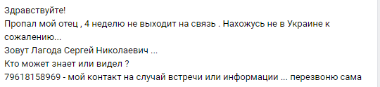 В местном паблике соцсети девушка разместила просьбу о помощи. Четвертую неделю ее отец, Лагода Сергей Николаевич, не выходит на связь.