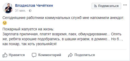 Работа столичных коммунальных служб в снегопад напомнила предпринимателю Владиславу Чечеткину анекдот, которым он поделился на своей странице в Facebook.
