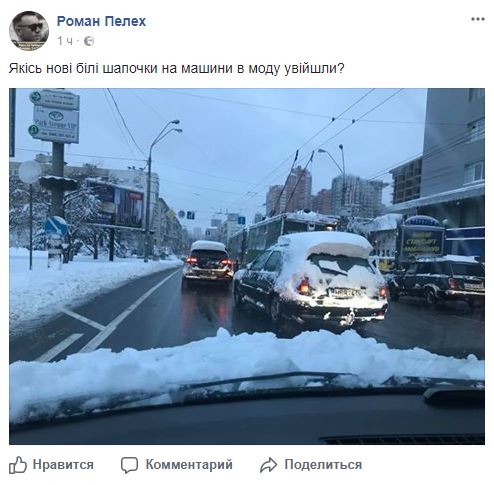 Жители Киева на своих страницах в социальных сетях активно шутят по поводу последствий снегопада, который практически парализовал движение транспорта в городе.