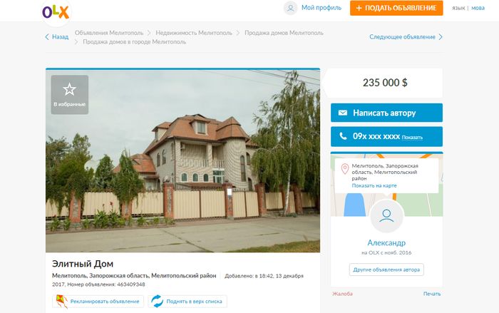 Некто Александр просит за элитный особняк 235 тысяч долларов США. Однако известно, что несколько месяцев назад цена доходила до полумиллиона долларов.