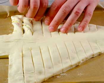 2. Раскатанный пласт теста выложить на противень и наметить ножом контуры елочки: внизу - ствол, вверху - подобие треугольника. Старайтесь это делать так, чтобы не прорезать пергамент.
