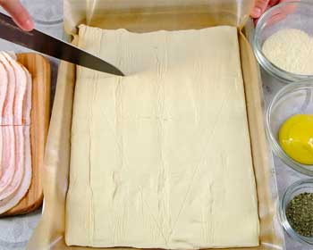 1. Слоеное тесто разморозить. Если у вас один пласт теста на 0,5 кг, надо разделить его на две равные части. Противень застелить пергаментом, который немного смазать подсолнечным маслом.
