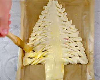 6. Смазать елку взбитым яйцом, посыпать кунжутом и поставить в разогретую до 180-190 градусов духовку на 30 минут.