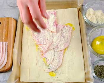 3. Смазать елочку в пределах контура горчицей, посыпать базиликом, выложить бекон и посыпать тертым сыром.