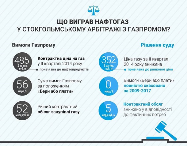 суд обязал «Нафтогаз» уплатить в пользу «Газпрома» сумму просроченной задолженности за поставки газа в размере $2,018 млрд, а также проценты с 22 декабря 2017 года по дату осуществления такого платежа в размере 0,03% за каждый день просрочки