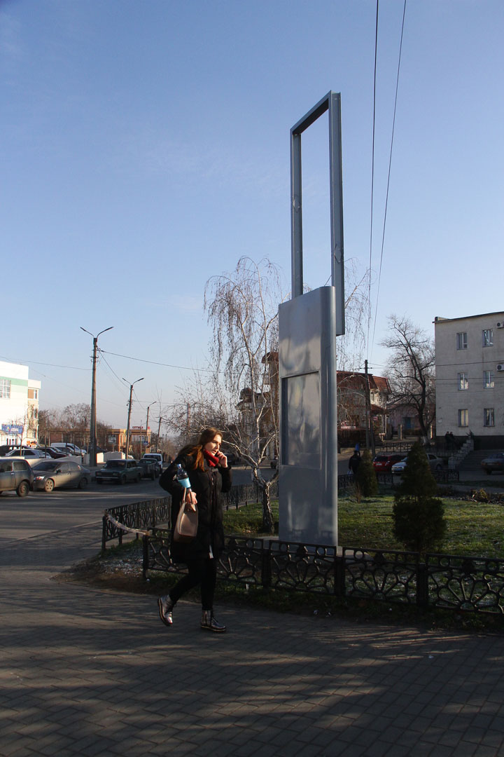 Принадлежит конструкция ЧП «Браво» (занимается наружной рекламой). По словам одного из руководителей фирмы Виталия Гаргопова, это будет информационный монитор, показывающий температуру воздуха, дату, время, поздравления и рекламную информацию.