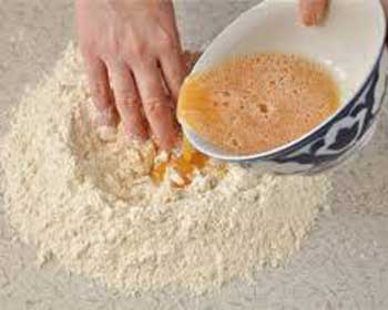 1. На рабочую поверхность насыпать муку горкой, сделать в ней лунку, постепенно вливая туда яйца, взбитые с солью и содой, замесить тесто. Тесто не должно быть липким и мягким. Убрать замешанное тесто в пакет на 15-20 минут.