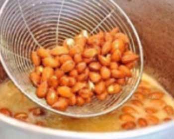 6. Шумовкой окунуть в горячий мед миндаль (грецкие орехи) и вынуть его в отдельную посуду, миндаль пригодится для украшения чак-чака.