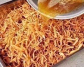 7. Из чашки с обжаренной лапшой убрать бумажные салфетки, залить лапшу горячим медовым сиропом и аккуратно перемешать сначала двумя деревянными или силиконовыми лопатками, затем смоченными холодной водой руками. Перемешивать осторожно, чтобы не поломать и не помять «лапшу». Не обожгитесь, сироп горячий!