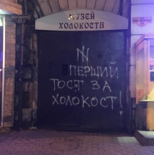 Кроме того, на входе в музей Холокоста в центре города вандалы написали «Первый тост — за Холокост».