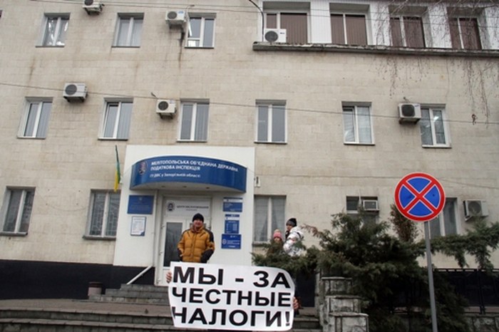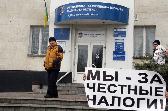 Мелитопольские предприниматели вновь вышли на акцию протеста под стены Мелитопольской ОГНИ. Представители малого и среднего бизнеса протестуют против блокировки налоговых накладных.