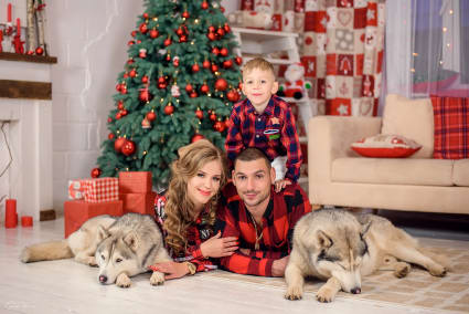 Съемка в студии - идеальный вариант для семейной праздничной фотосессии, так как в студии всегда тепло, готов разнообразный новогодний антураж, а профессиональный фотограф настроит правильный свет и сделает качественные обработанные фото, которые лягут в толстый семейный альбом или украсят стены дома. Главное - правильно подобрать наряд для всей семьи и прийти с хорошим настроением.