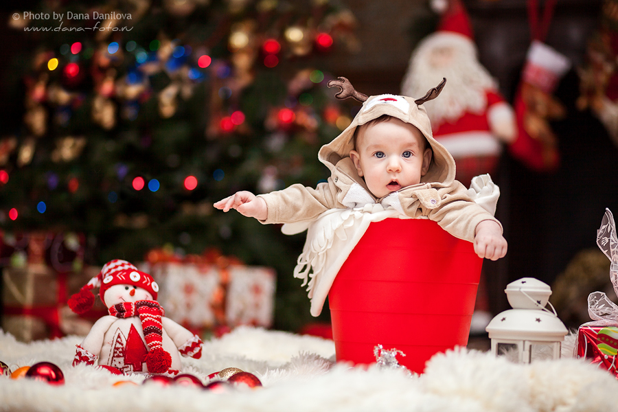 • Раскидайте мягкие игрушки, расставьте подарки, возьмите красочную новогоднюю книжку - малыш с удовольствием позволит себя сфотографировать, пока будет разглядывать такое обилие интересных предметов.