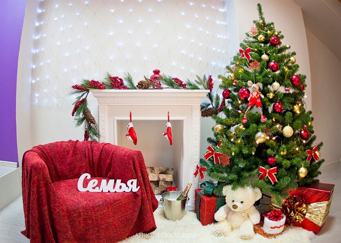 • В студиях новогодние фотозоны всегда продуманы: есть стильно украшенная елка, удобное кресло около камина, множество муляжей подарков, гирлянды, модные пледы крупной вязки и пр. Можно встретить и различные гамаки, горы искусственного снега и даже вентиляторы, которые его раздувают.