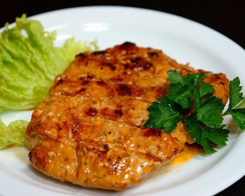 8. Готовую отбивную подавать с соусом, картофельным пюре и свежей петрушкой.