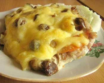 4. Грибы порезать и выложить на сыр. Затем полить майонезом (в очень умеренных количествах), посолить и посыпать оставшимся сыром.