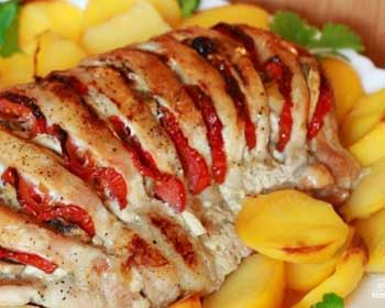 Желательно, чтобы то, чем фаршируется грудка, было хорошо обернуто мясом. Поэтому много класть не стоит, так как чем больше начинки - тем больше риск, что начинка вылезет во время выпекания.