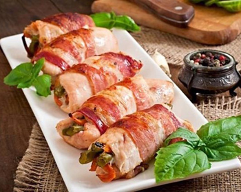 4. Посыпать каждое филе перцем и щепоткой измельченной зелени. Свернуть плотным рулетом. Каждый рулетик обернуть полоской бекона.