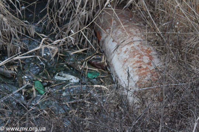 Выезжаем на место. Это практически граница с Новенским сельским советом. С одной стороны пустыря - частная застройка, жители которой частично распахали целину (они бы и дальше пахали, но это невозможно, даже сейчас там грязь), с другой – гаражный кооператив. На поросшем камышом поле кое-где земельные насыпи - это места разрытия на магистральном канализационном коллекторе. Подходим к одному такому разрытию: несколько труб метрового диаметра, вонючая жижа с плавающим мусором.