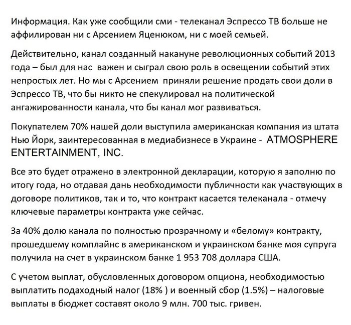 Супруга министра внутренних дел Арсена Авакова заработала на продаже своей доли канала "Эспрессо" почти два миллиона долларов.