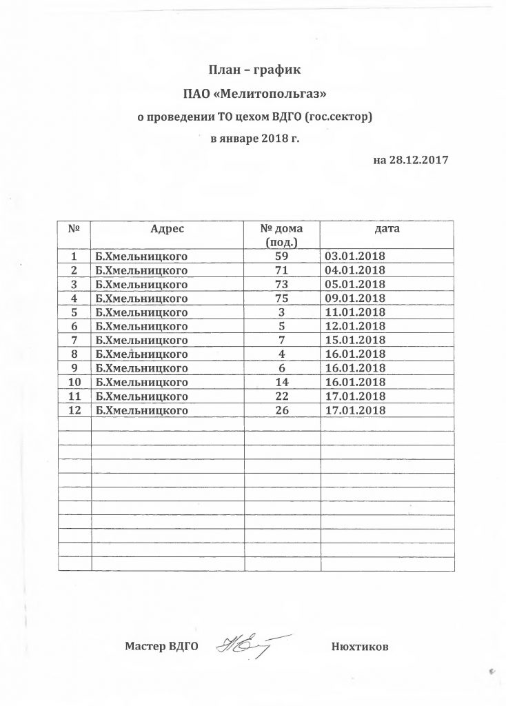 В ПАО «Мелитопольгаз» обнародовали план проведения планово-технического обслуживания внутридомовых систем газоснабжения на январь 2018 г.