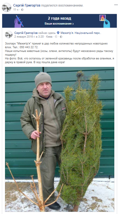 "Зоопарк "Межигорье" примет в дар любое количество непроданных новогодних елок. Наши копытные животные (козы, олени, антилопы) будут несказанно рады такому подарку. На фото все, что осталось от зеленой красавицы после ее обработки оленями, я держу в правой руке. В ход пошла даже кора!" - написал Сергей.