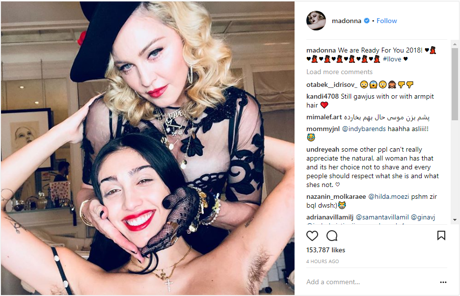 Культовая американская певица Мадонна выложила на своей странице в Instagram фото со своей дочкой. «Мы готовы к 2018 году», - подписала она снимок. Волну обсуждений этот снимок вызвал в связи с тем, что ее дочь демонстрирует на этом снимке небритые подмышки.