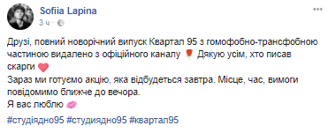 На гомофобную сценку активисты пожаловались в YouTube и новогоднего выпуска на канале "Квартал 95" уже нет, однако в сети полный выпуск остался.