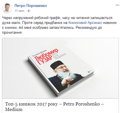 "Из-за напряженного рабочего графика, времени на чтение остается очень мало. Однако среди приобретенных на Книжном Арсенале новинок есть книги, которые мне особенно запомнились. Рекомендую к прочтению", - говорится в сообщении.