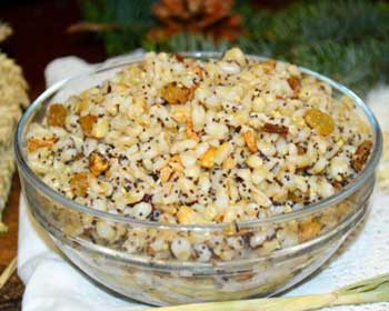 Вам понадобятся: 0,5 кг пшеницы*, 200 г мака, сахар, мед, изюм, грецкие орехи.