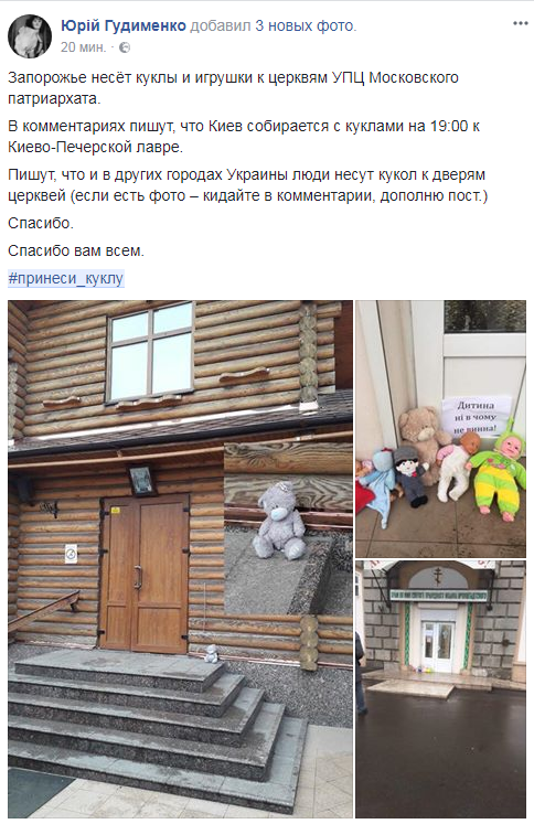 Запорожцы поддерживают флешмоб #принеси_куклу, запущенный после скандала с отказом священника отпевать погибшего 2-летнего ребенка.